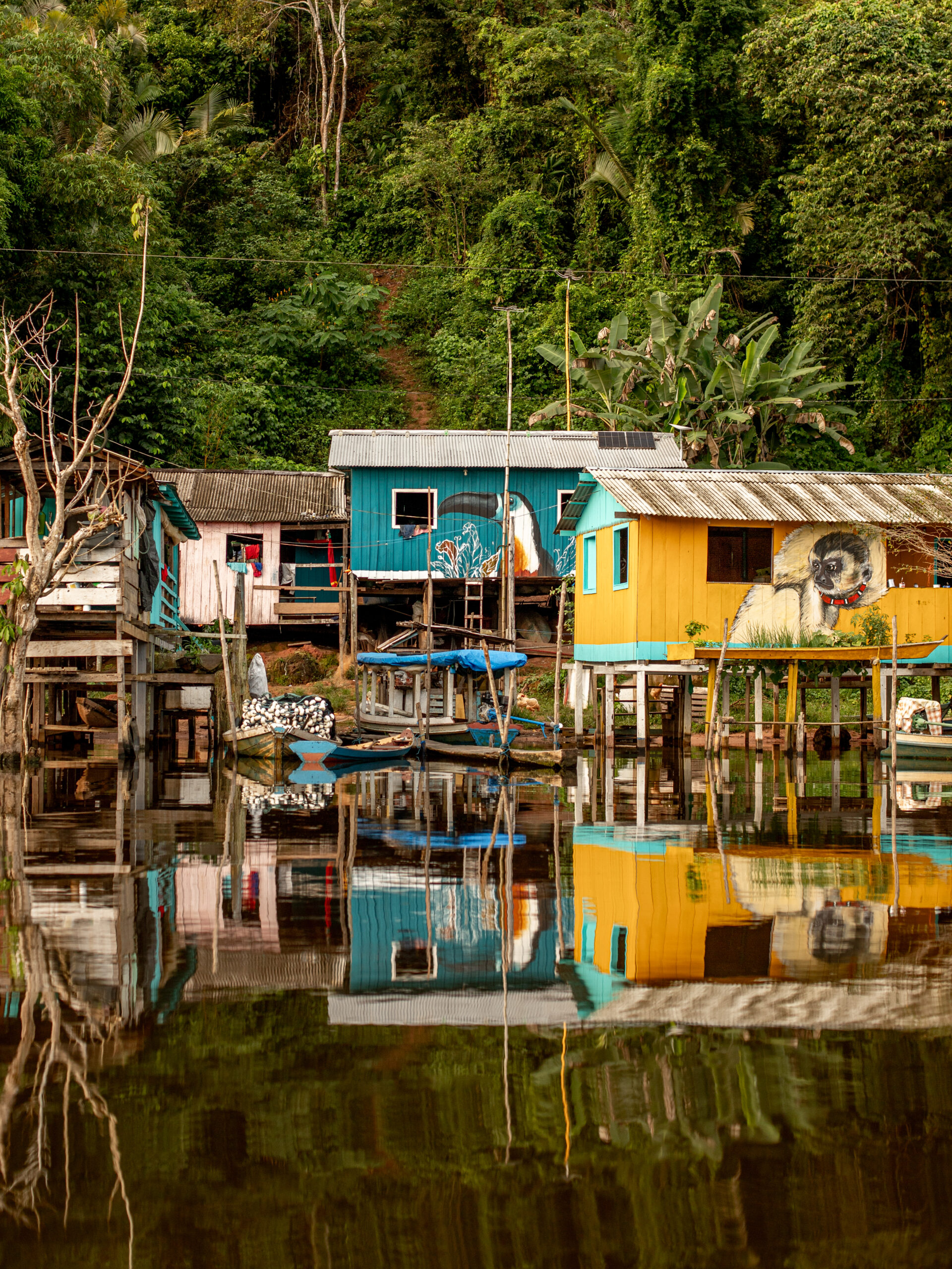 As fotografias emergem de um território onde tudo está em movimento: as casas, a natureza, a luz. Flutuar, aqui, não é apenas um estado físico, mas uma forma de existir, de habitar. A série convida o olhar a navegar nesse entremeio: entre terra, céu e água, entre o banzeiro e o silêncio, entre espaços que deslizam e vidas que fluem com o rio.